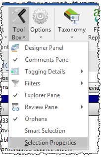 - On the Disclosure Management ribbon, click Tool Box, then Selection Properties. Without a table or paragraph selected, Selection Properties appears grayed out.